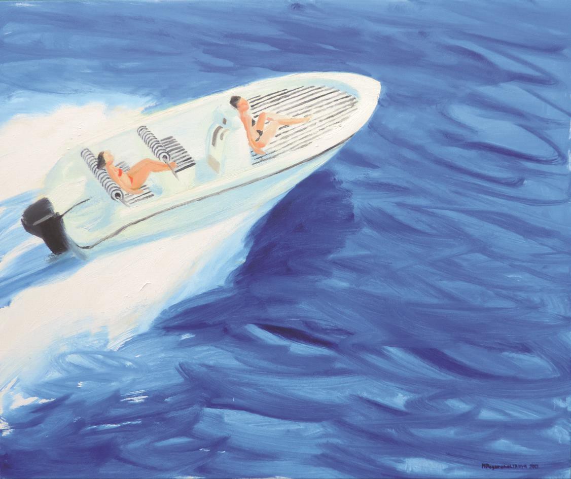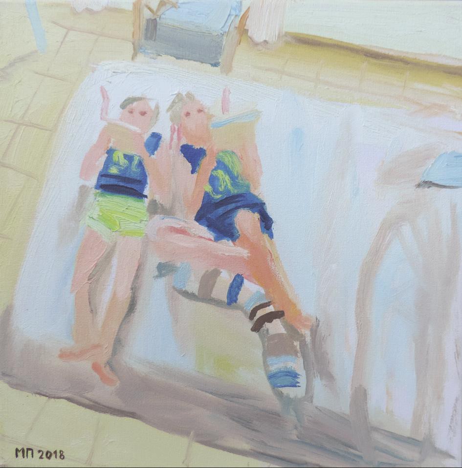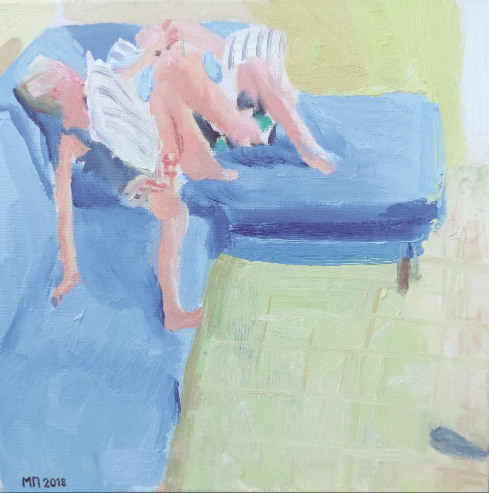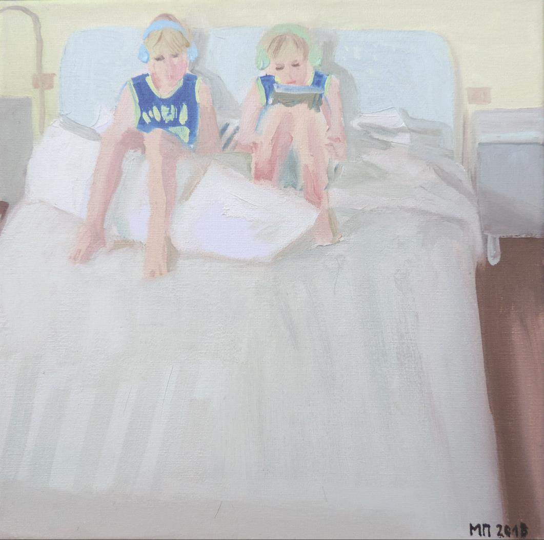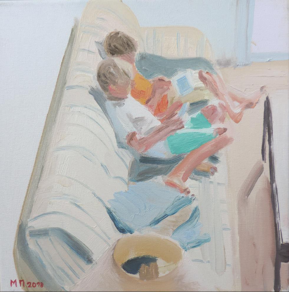 Maria Pogorzhelskaya works with postmedial painting. Behind all the paintings are photographs that she has taken herself or found in the endless internet noise. Photography’s mission to document is extended with the ability of the painting to transform the moment into eternity. When you see Marias paintings, a feeling of ease, whirlwind, happiness is created. The white canvas is sometimes illuminated by fast semi-transparent brush strokes, and is sometimes hidden behind strong color surfaces that are balanced by fast, dashed lines. Movement and stillness as painterly means not only create thoughtful compositions but also harmonize with the images that the artist creates in front of us. Russian-born Maria Pogorzhelskaya lives with her large artist family in Milan. In the family there are two even old boys, two cousins who throughout their upbringing shared everyday life and party, school and home. Maria Pogorzelskaja is the mother of one of them. We follow her painterly observations and see two children who have sunk into another world. They are here in the room, but at the same time in a completely different universe. We look at children who are relaxed resting on a sofa while their consciousness wanders among difficult mazes, solving logistical problems, creating, fighting, dying and getting new life. You are fascinated by the ability of man to move to alien worlds with the power of play or imagination.